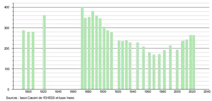 L'évolution du nombre d'habitants est connue à travers les recensements de la population effectués dans la commune depuis 1793. Pour les communes de moins de 10 000 habitants, une enquête de recensement portant sur toute la population est réalisée tous les cinq ans, les populations légales des années intermédiaires étant quant à elles estimées par interpolation ou extrapolation[21]. Pour la commune, le premier recensement exhaustif entrant dans le cadre du nouveau dispositif a été réalisé en 2007[22].