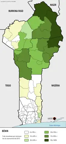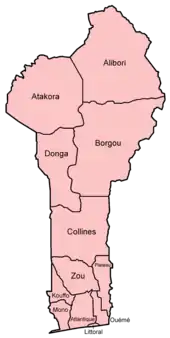 Le Bénin (/be.nɛ̃/[5]), en forme longue la République du Bénin (en yoruba : Orílɛ̀-èdè Olómìnira ilɛ̀ Benin ; en gun-gbe : Beninto ; en fon : Benɛto), anciennement connu sous le nom de Dahomey, est un État d'Afrique de l'Ouest, qui couvre une superficie de 114 763 km2 et s'étend sur 700 km[6], du fleuve Niger au nord à la côte atlantique au sud. Le Bénin comptait 13 301 694 habitants en 2021[1]. Le pays fait partie des États membres de la CEDEAO et a comme voisins le Togo à l'ouest, le Nigeria à l'est, le Niger au nord-est et le Burkina Faso au nord-ouest.