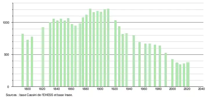 L'évolution du nombre d'habitants est connue à travers les recensements de la population effectués dans la commune depuis 1793. Pour les communes de moins de 10 000 habitants, une enquête de recensement portant sur toute la population est réalisée tous les cinq ans, les populations légales des années intermédiaires étant quant à elles estimées par interpolation ou extrapolation[21]. Pour la commune, le premier recensement exhaustif entrant dans le cadre du nouveau dispositif a été réalisé en 2005[22].