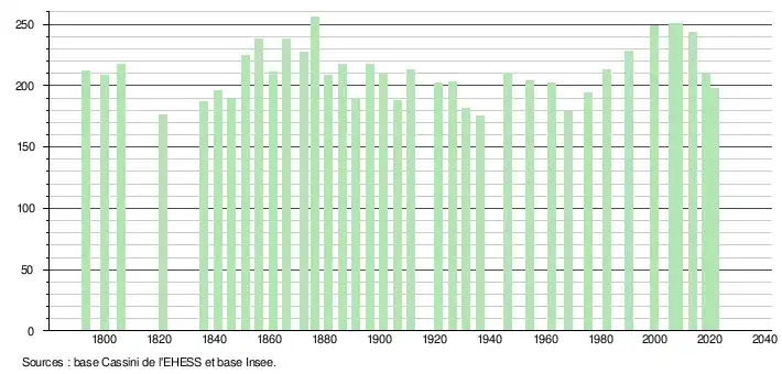 L'évolution du nombre d'habitants est connue à travers les recensements de la population effectués dans la commune depuis 1793. Pour les communes de moins de 10 000 habitants, une enquête de recensement portant sur toute la population est réalisée tous les cinq ans, les populations légales des années intermédiaires étant quant à elles estimées par interpolation ou extrapolation[20]. Pour la commune, le premier recensement exhaustif entrant dans le cadre du nouveau dispositif a été réalisé en 2008[21].