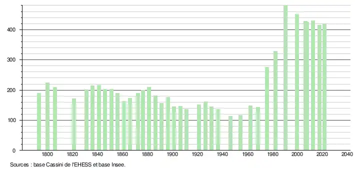 L'évolution du nombre d'habitants est connue à travers les recensements de la population effectués dans la commune depuis 1793. Pour les communes de moins de 10 000 habitants, une enquête de recensement portant sur toute la population est réalisée tous les cinq ans, les populations légales des années intermédiaires étant quant à elles estimées par interpolation ou extrapolation[17]. Pour la commune, le premier recensement exhaustif entrant dans le cadre du nouveau dispositif a été réalisé en 2007[18].