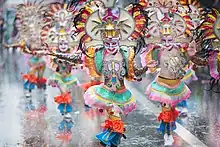 Festival de MassKara, à Bacolod. Masques et déguisements sous la pluie. La principale activité du festival est le défilé de danseuses en costumes colorés et masques joyeux dans la ville, au son d'une musique américaine. Octobre 2019.
