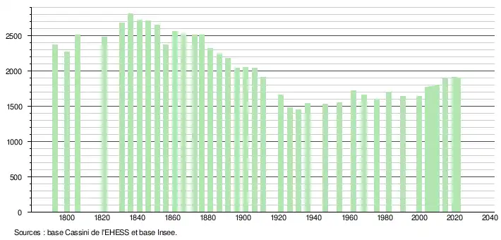 L'évolution du nombre d'habitants est connue à travers les recensements de la population effectués dans la commune depuis 1793. Pour les communes de moins de 10 000 habitants, une enquête de recensement portant sur toute la population est réalisée tous les cinq ans, les populations légales des années intermédiaires étant quant à elles estimées par interpolation ou extrapolation[28]. Pour la commune, le premier recensement exhaustif entrant dans le cadre du nouveau dispositif a été réalisé en 2004[29].