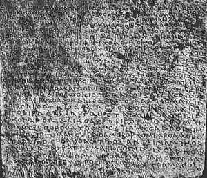L'inscription de Rabatak (Afghanistan du Nord, province de Baghlan, dans la Bactriane de l'empire kouchan) est un texte célèbre, rédigé en bactrien[N 1], découvert en mars 1993, qui ne date pas de l'an 1 de Kanishka (le plus célèbre monarque kouchan) et n'émane pas de Kanishka non plus, mais d'un dignitaire[8]. Les ruines de Rabatak se trouvent en pays montagneux et ont l'apparence d'une forteresse dominant un col, semblable en cela aux ruines de Surkh Kotal.