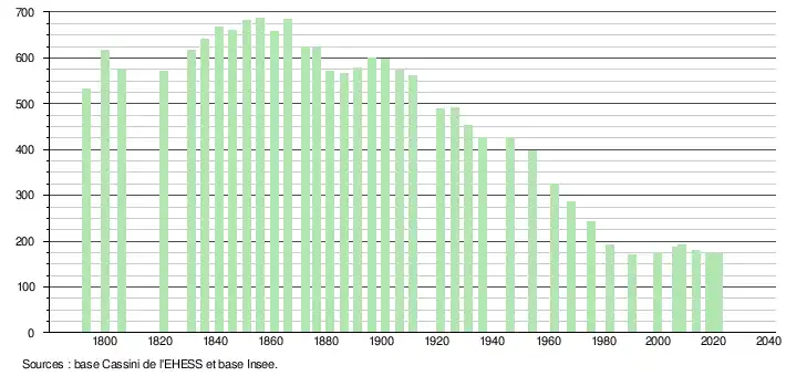 L'évolution du nombre d'habitants est connue à travers les recensements de la population effectués dans la commune depuis 1793. Pour les communes de moins de 10 000 habitants, une enquête de recensement portant sur toute la population est réalisée tous les cinq ans, les populations légales des années intermédiaires étant quant à elles estimées par interpolation ou extrapolation[33]. Pour la commune, le premier recensement exhaustif entrant dans le cadre du nouveau dispositif a été réalisé en 2008[34].
