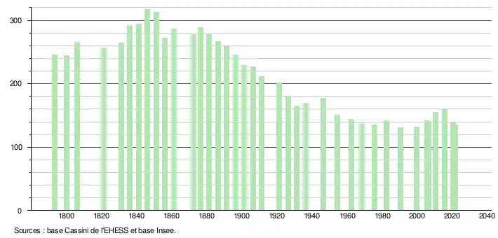 L'évolution du nombre d'habitants est connue à travers les recensements de la population effectués dans la commune depuis 1793. Pour les communes de moins de 10 000 habitants, une enquête de recensement portant sur toute la population est réalisée tous les cinq ans, les populations légales des années intermédiaires étant quant à elles estimées par interpolation ou extrapolation[24]. Pour la commune, le premier recensement exhaustif entrant dans le cadre du nouveau dispositif a été réalisé en 2005[25].