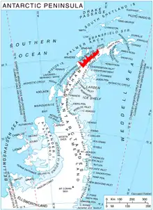 La baie mesure 42 km de large et se trouve au sud de la péninsule de Chavdar et au nord de la péninsule de Pefaur (Ventimiglia), à 20 km à l'ouest de la Terre de Graham.