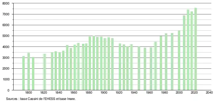 - Population municipale légale en vigueur au 1er janvier 2024, millésimée 2021, définie dans les limites territoriales en vigueur au 1er janvier 2023, date de référence statistique : 1er janvier 2021.