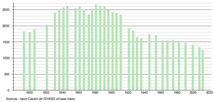 L'évolution du nombre d'habitants est connue à travers les recensements de la population effectués dans la commune depuis 1793. À partir du , les populations légales des communes sont publiées annuellement dans le cadre d'un recensement qui repose désormais sur une collecte d'information annuelle, concernant successivement tous les territoires communaux au cours d'une période de cinq ans. Pour les communes de moins de 10 000 habitants, une enquête de recensement portant sur toute la population est réalisée tous les cinq ans, les populations légales des années intermédiaires étant quant à elles estimées par interpolation ou extrapolation[23]. Pour la commune, le premier recensement exhaustif entrant dans le cadre du nouveau dispositif a été réalisé en 2007[24],[Note 1].