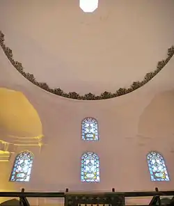Les murs extérieurs sont construits en rangées alternant pierre de taille et briques. Le vestiaire de la section des hommes a quatre vitraux en arc brisé au-dessus de la façade et le vestiaire des femmes a trois fenêtres.