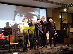 Balázs Györe (premier à droite) avec des membres du groupe littéraire d'avant-garde Fölöspéldány, fondé  au printemps 1979. Photo prise à bibliothèque nationale Széchényi en 2016