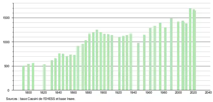 L'évolution du nombre d'habitants est connue à travers les recensements de la population effectués dans la commune depuis 1793. Pour les communes de moins de 10 000 habitants, une enquête de recensement portant sur toute la population est réalisée tous les cinq ans, les populations légales des années intermédiaires étant quant à elles estimées par interpolation ou extrapolation[35]. Pour la commune, le premier recensement exhaustif entrant dans le cadre du nouveau dispositif a été réalisé en 2005[36].