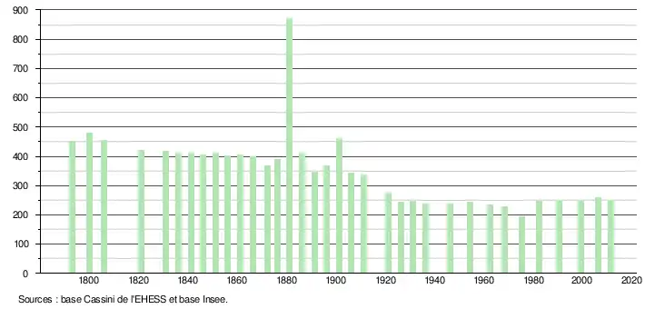 L'évolution du nombre d'habitants est connue à travers les recensements de la population effectués dans la commune depuis 1793. À partir du , les populations légales des communes sont publiées annuellement dans le cadre d'un recensement qui repose désormais sur une collecte d'information annuelle, concernant successivement tous les territoires communaux au cours d'une période de cinq ans. Pour les communes de moins de 10 000 habitants, une enquête de recensement portant sur toute la population est réalisée tous les cinq ans, les populations légales des années intermédiaires étant quant à elles estimées par interpolation ou extrapolation[2]. Pour la commune, le premier recensement exhaustif entrant dans le cadre du nouveau dispositif a été réalisé en 2006[3],[Note 1].
