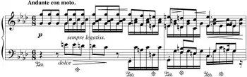 la valse lente du premier thème et des variations : thème I en fa mineur, mesures 7 à 22, variation I, mesures 23 à 36, et variation II, mesures 58 à 71. Le deuxième thème, thème II à la sous-dominante de si bémol majeur, mesures 80 à 99, Le deuxième thème pastoral est un croisement entre une barcarolle et un choral. Il est suivi d'un épisode dans lequel la tonalité passe en la bémol majeur. Le retour de l'introduction, dans une tonalité inattendue, est musicalement un moment de grand pathos. Comme l'écrit Samson : « Le voyage entre ce point et la reprise [du thème II] est l'un des passages les plus magiques de Chopin. Les principaux fils du Thème I sont ici isolés et présentés en combinaison contrapuntique ... De plus, l'un de ces brins est progressivement et magnifiquement transformé en un retour discret de l'introduction dans la région éloignée de premier plan de La majeur, une transition rendue possible par les notes répétées communes de l'introduction et du Thème I. C'est le point central de la structure [et] permet à sa reprise de commencer dans la tonalité inattendue de Ré mineur. »[11],[12].