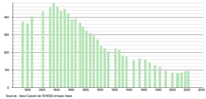 L'évolution du nombre d'habitants est connue à travers les recensements de la population effectués dans la commune depuis 1793. Pour les communes de moins de 10 000 habitants, une enquête de recensement portant sur toute la population est réalisée tous les cinq ans, les populations légales des années intermédiaires étant quant à elles estimées par interpolation ou extrapolation[14]. Pour la commune, le premier recensement exhaustif entrant dans le cadre du nouveau dispositif a été réalisé en 2007[15].