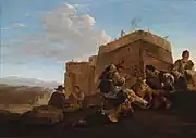 Le plus souvent, comme cela transparaît dans le commentaire de Rosa, une telle dérision visait non pas les artistes, mais bien ceux qui achetaient leurs œuvres[19]. Quant aux peintres eux-mêmes, ils étaient souvent admirés : Van Laer avait la réputation d’un peintre dont les œuvres valaient cher et Michelangelo Cerquozzi était introduit dans les cercles aristocratiques et comptait au nombre de ses amis des gens comme Pietro Da Cortona[20]. Par ailleurs, étant donné que les Bamboccianti étaient pour la plupart des étrangers et que ce qu’ils peignaient s’inscrivait en dehors des intérêts de l’Accademia, souvent ils se joignirent aux Bentvueghels, une « guilde » plus ou moins organisée – surtout connue pour les excès de ses fêtes bien arrosées – qui constituait à plus d’un titre une alternative aux institutions officielles[21]. Les Bamboccianti n’étaient toutefois pas interdits d’entrée à l’Accademia, puisque Van Laer, de même que Cerquozzi, sont associés aux deux groupes (Van Laer faisait également partie des Bentvueghels)[22].