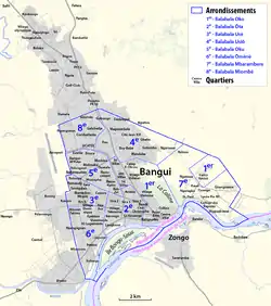 | 1er | Gba-vaka Oko | 15 | 808 | 7 741 | 4° 21′ 45″ N, 18° 34′ 58″ E | ![]() Carte des arrondissements et quartiers de Bangui. |