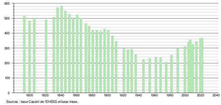 L'évolution du nombre d'habitants est connue à travers les recensements de la population effectués dans la commune depuis 1793. Pour les communes de moins de 10 000 habitants, une enquête de recensement portant sur toute la population est réalisée tous les cinq ans, les populations légales des années intermédiaires étant quant à elles estimées par interpolation ou extrapolation[18]. Pour la commune, le premier recensement exhaustif entrant dans le cadre du nouveau dispositif a été réalisé en 2004[19].