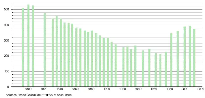L'évolution du nombre d'habitants est connue à travers les recensements de la population effectués dans la commune depuis 1793. À partir du , les populations légales des communes sont publiées annuellement dans le cadre d'un recensement qui repose désormais sur une collecte d'information annuelle, concernant successivement tous les territoires communaux au cours d'une période de cinq ans. Pour les communes de moins de 10 000 habitants, une enquête de recensement portant sur toute la population est réalisée tous les cinq ans, les populations légales des années intermédiaires étant quant à elles estimées par interpolation ou extrapolation[12]. Pour la commune, le premier recensement exhaustif entrant dans le cadre du nouveau dispositif a été réalisé en 2006[13],[Note 1].
