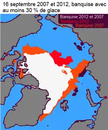 En septembre 2005, la superficie de la banquise arctique était de 25 % inférieure à celle qu’elle avait en moyenne dans les années 1980. En septembre 2006, l'extension de la banquise était proche du record de 2005, sans toutefois le battre. Le 18 septembre 2007, il n'y avait plus que 4,17 millions de kilomètres carrés de glace restant dans l'Arctique[34], ce qui bat le record de 2005 (5,32) de plus de 1 million de kilomètres carrés. En général, les satellites mesurent la superficie de la banquise là où de la glace en concentration de 15 % et plus est présente. Ces données sont prises régulièrement par la NSIDC et la UIUC. Par contre, il n'y avait que 2,92 millions de kilomètres carrés de banquise avec une concentration de glace de 95 % et plus, ce qui montre un affaiblissement de la glace pérenne. C'est de loin la plus petite superficie observée par les satellites. De 1979 (début des observations régulières par satellite) à 2011, la banquise a diminué de près de 30 % en été. Cette baisse a continué à s'accélérer. En 2012, le minimum au 16 septembre 2012 a atteint 3,41 millions de kilomètres carrés d'extension, soit 50 % de la normale[35](le maximum a été atteint le 20 mars 2012 avec 15,24)[36].