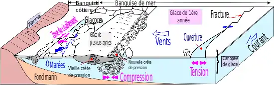 Les vents, les courants et les chocs avec les icebergs dérivants font bouger la banquise, la fracturent (phénomène mesurable par des hydrophones, géophones et sismomètres qui enregistrent des « tremblements de glace »), la compriment et créent des fissures, des canaux, des failles, des crêtes de compression, des chevauchements de plaques, etc.