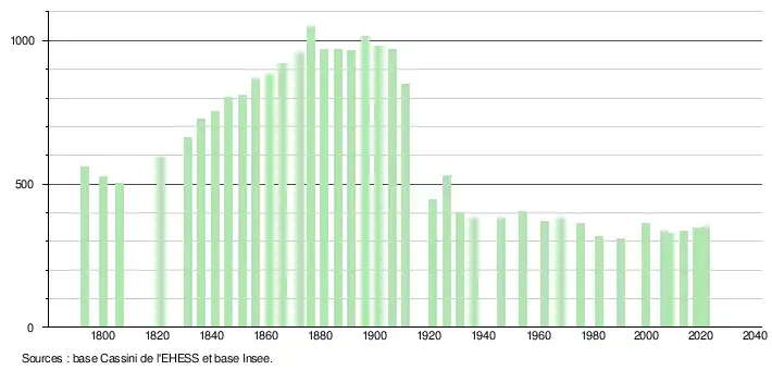 L'évolution du nombre d'habitants est connue à travers les recensements de la population effectués dans la commune depuis 1793. Pour les communes de moins de 10 000 habitants, une enquête de recensement portant sur toute la population est réalisée tous les cinq ans, les populations légales des années intermédiaires étant quant à elles estimées par interpolation ou extrapolation[24]. Pour la commune, le premier recensement exhaustif entrant dans le cadre du nouveau dispositif a été réalisé en 2008[25].