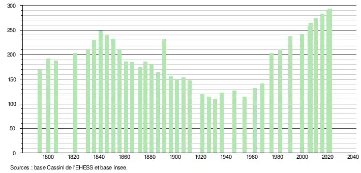L'évolution du nombre d'habitants est connue à travers les recensements de la population effectués dans la commune depuis 1793. Pour les communes de moins de 10 000 habitants, une enquête de recensement portant sur toute la population est réalisée tous les cinq ans, les populations légales des années intermédiaires étant quant à elles estimées par interpolation ou extrapolation[17]. Pour la commune, le premier recensement exhaustif entrant dans le cadre du nouveau dispositif a été réalisé en 2005[18].