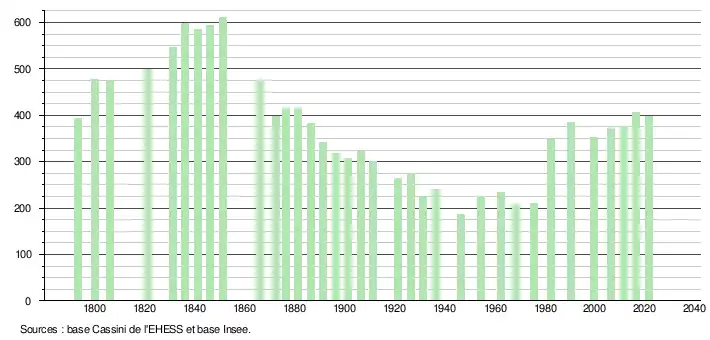 L'évolution du nombre d'habitants est connue à travers les recensements de la population effectués dans la commune depuis 1793. Pour les communes de moins de 10 000 habitants, une enquête de recensement portant sur toute la population est réalisée tous les cinq ans, les populations légales des années intermédiaires étant quant à elles estimées par interpolation ou extrapolation[17]. Pour la commune, le premier recensement exhaustif entrant dans le cadre du nouveau dispositif a été réalisé en 2006[18].