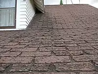 | Gauche : Exemple de bardeaux cassés par l'eau qui ruisselle le long du toit. Droite : Bardeaux gondolés par le vieillissement naturel. La partie bombée et la tête de clou exposée sont alors des zones très vulnérables. | |