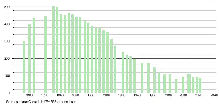 L'évolution du nombre d'habitants est connue à travers les recensements de la population effectués dans la commune depuis 1793. Pour les communes de moins de 10 000 habitants, une enquête de recensement portant sur toute la population est réalisée tous les cinq ans, les populations légales des années intermédiaires étant quant à elles estimées par interpolation ou extrapolation[17]. Pour la commune, le premier recensement exhaustif entrant dans le cadre du nouveau dispositif a été réalisé en 2007[18].