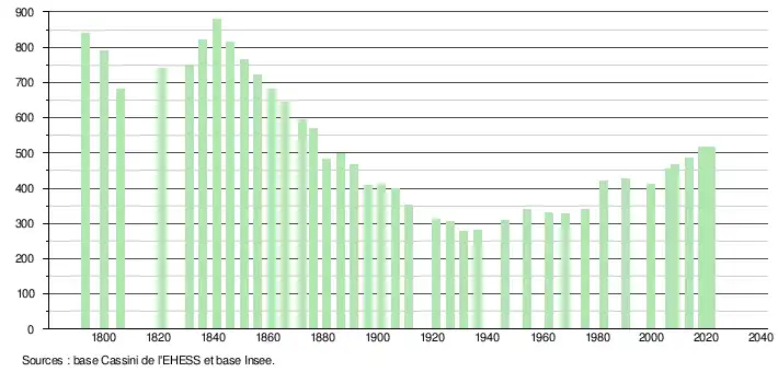 L'évolution du nombre d'habitants est connue à travers les recensements de la population effectués dans la commune depuis 1793. Pour les communes de moins de 10 000 habitants, une enquête de recensement portant sur toute la population est réalisée tous les cinq ans, les populations légales des années intermédiaires étant quant à elles estimées par interpolation ou extrapolation[18]. Pour la commune, le premier recensement exhaustif entrant dans le cadre du nouveau dispositif a été réalisé en 2008[19].