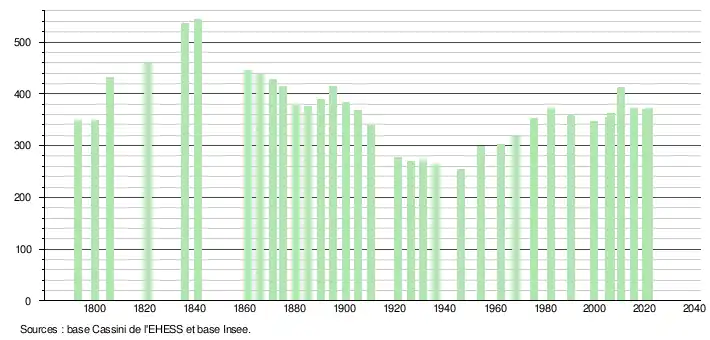 L'évolution du nombre d'habitants est connue à travers les recensements de la population effectués dans la commune depuis 1793. Pour les communes de moins de 10 000 habitants, une enquête de recensement portant sur toute la population est réalisée tous les cinq ans, les populations légales des années intermédiaires étant quant à elles estimées par interpolation ou extrapolation[17]. Pour la commune, le premier recensement exhaustif entrant dans le cadre du nouveau dispositif a été réalisé en 2005[18].
