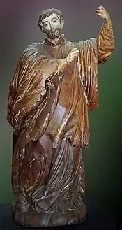 Le baroque a donné lieu à une vaste production de statuaire sacrée. Partie intégrante de la pratique religieuse, la statuaire dévotionnelle a trouvé place aussi bien dans le temple que dans la maison privée. Cabral avait déjà apporté une statue de Notre-Dame-des-Navigateurs avec lui, et les premières pièces qui sont parties du pays ont été importées du Portugal, en compagnie des missionnaires. Tout au long du baroque, l'importation d'œuvres s'est poursuivie, et nombre de celles qui existent encore dans les églises et les collections de musée sont d'origine européenne. Mais depuis le XVIe siècle, des écoles locales de sculpture ont commencé à se former, composées principalement de religieux franciscains et bénédictins, mais avec quelques artisans laïcs, qui travaillaient principalement l'argile. Les premières images d'argile bouillie créées au Brésil qui ont été rapportées avec certitude sont celles de João Gonçalo Fernandes, datant des années 1560 et qui, par chance, a survécu à l'époque. Les indigènes ont pu contribuer plus activement à cette technique, en enseignant à l'homme blanc des techniques de peinture sur céramique et des connaissances sur les pigments naturels tels que le tabatinga (pt) et le tauá (pt), qu'ils ont maîtrisé pendant des siècles[110],[111]. Les Indiens ont également donné leur collaboration en tant que santeiros, surtout dans les réductions du sud et de certaines du nord-est, et dans ces cas on trouve souvent des traces ethniques indiennes sur le visage des icônes, comme on peut le voir dans certaines sculptures des Sept villages des Missions (pt)[112],[113]. Les Jésuites, en revanche, ont donné la préférence au bois, qui à partir de la fin du XVIIe siècle va prédominer, déterminant également des changements dans la conformation des pièces. La technique de l'époque exigeait que les pièces d'argile soient modelées de manière compacte, avec un faible relief et sans parties saillantes, qui pouvaient facilement se briser pendant la cuisson. Le bois, en revanche, permettait de sculpter avec des formes ouvertes, volantes et dynamiques, beaucoup plus libres dans l'espace tridimensionnel[111]. La plupart des statues baroques brésiliennes ont finalement été réalisées en bois polychrome. Au début, l'argile était surtout utilisée, bien qu'elle n'ait jamais été abandonnée, et la pierre était rare, plus réservée à la décoration des façades et des monuments publics[114].