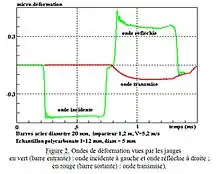 Le choc induit dans la barre entrante une onde incidente qui se propage vers l’échantillon. Lorsqu’elle l’atteint, elle est réfléchie dans la barre entrante et transmise dans la barre sortante. Des jauges de déformation placées sur les barres permettent de mesurer la déformation associée à ces trois ondes (fig. 2).