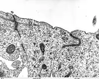 Les cellules endothéliales sont entourées par une couche protéique, la lame basale[11] épaisse de 40 à 50 nm, donc visible seulement au microscope électronique.