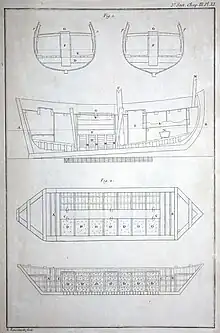 Plans de bateaux-viviers de la fin du XVIIIe siècle : la figure 1 en haut représente une barque pour transporter les poissons de mer en vie, la figure 2 en bas une bascule pour transporter par eau les poissons d'eau douce en vie.