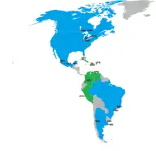 Lieux des Jeux panaméricains : Vert = Pays qui ont accueilli un Jeux panaméricains. Bleu = Pays qui ont accueilli deux Jeux panaméricains ou plus. Points rouges = Villes qui ont accueilli les Jeux panaméricains.