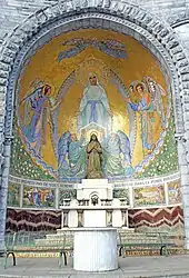 La Vierge Marie est figurée sur une mosaïque monumentale décorant la voûte en cul-de-four du chœur, dont le dessin est dû à Edgard Maxence ; entourée de nombreux anges, bras ouverts, elle présente un geste d'accueil aux pèlerins, accompagnée de la devise qui manifeste son intercession : « Par Marie à Jésus ».
