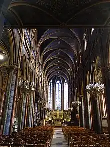 L'édifice comprend une nef de sept travées, flanquée de bas-côtés, qui se prolonge sans transept, par le chœur de trois travées, également avec bas-côtés, terminé par une abside polygonale à cinq pans sans déambulatoire. La première travée de la nef est séparée des travées correspondantes des deux bas-côtés par un mur, constituant une sorte de narthex que surplombe la tribune de l'orgue. Au début des bas-côtés, de part et d'autre du narthex, sont ainsi délimitées deux sortes de chapelles dont l'une, au nord, contient les fonts baptismaux. Les bas-côtés du chœur constituent quant à eux deux chapelles de trois travées, celle du nord est consacrée à la Vierge, celle du sud au Saint-Sacrement.