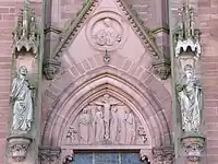 Sur le tympan de l'entrée latérale gauche, on peut admirer l'adoration des mages. Dans l'angle de cette entrée latérale, la statue d'Albert de Haguenau, fondateur du prieuré, a été réalisée en 1960 par Joseph Sauer, sculpteur d'Oberhergheim en 1960. Sur le tympan de l'entrée latérale droite, le jugement dernier a été sculpté[27].