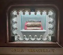 Dans la sacristie, située sur le flanc Est de l'église, ont été redécouverts en 1966, à l'occasion de fouilles, la sépulture du voyant Pierre Port-Combet, ainsi que les vestiges de l'Osier qui avait saigné. Ces reliques ont été découvertes à 1,8 m sous le dallage actuel[13].