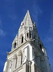 Sous l'impulsion de Félix Fournier, curé de la paroisse et futur évêque de Nantes, la construction de l'église actuelle s'échelonne de 1844 (pose de la première pierre) à 1869 (bénédiction de l'édifice)[9] sur un terrain exigu qui l'oblige à être orientée sur un axe nord-sud, et non pas est-ouest comme le voudrait la tradition chrétienne (soleil levant sur le sanctuaire). L'édification du clocher occupe à elle seule les quinze dernières années des travaux. Une médaille commémorative célèbre la pose de la première pierre de la nouvelle église, sous le règne de Louis-Philippe, l'administration du préfet Achille Chaper et du maire Ferdinand Favre[10]. L'église est bâtie en granite de la région, ainsi qu'en pierres dures et tuffeau de Touraine. Le projet est confié à Jean-Baptiste-Antoine Lassus[11], élève de Henri Labrouste et collaborateur de Eugène Viollet-le-Duc, qui en fait, avec Piel[12], l'un des tout premiers projets néo-gothiques en France[Note 1]. Elle est érigée en basilique mineure le par le pape Léon XIII[13].