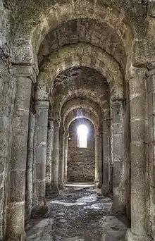 Cette solution architecturale sans contreforts est d'un grand intérêt. La solidité est obtenue par la disposition orthogonale qui distribue la pression mutuelle et réciproque dans toutes les structures, notamment dans les absides. Cette articulation du bâtiment détermine la segmentation de l'espace intérieur, dans lequel nous trouvons un espace réduit dans la nef, un autre plus ample dans la croisée et enfin un très intime dans les trois chapelles. Cette différenciation des espaces était marquée originellement par des chancels perdus, mais dont restent des marques dans les fentes pratiquées dans les murs et dans le sol, destinées à les recevoir et qui sont bien visibles en bout de nef et dans les accès aux absides[6].