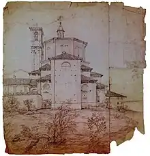 « [...] Ce bâtiment a été dessiné, c'est pourquoi il tient, par Bramante, architecte du plus célèbre dans toute la chrétienté, ce bâtiment est très remarquable par cinq fois grâce à sa belle proportion en octogone, et carrée,avec la présence de sept chapelles, disposés de manière que l'une ne gêne pas l'autre. Il comporte une voûte avec des niches en dessous pour placer les statues, il a une autre voûte face à une porte au-dessus de laquelle peuvent se lire des vers de l'année 1518 d'Alberto Bosso qui vécut à cette époque en étudiant de grammaire à Legnano où, mort, il fut enterré [...] »