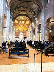 La façade de la basilique, de style romano-lombard très simple, est faite de briques, avec des pierres d'angle et des encadrements de fenêtres en grès. Le niveau du sol de l'église est nettement plus bas que celui de la rue. Le portail, en grès et marbre, porte, dans le tympan, la figure de Saint Michel au centre, flanquée sur les côtés par les images de deux prières. Ces sculptures proviennent probablement de la basilique précédente, puisqu'elles sont datées de 1050-1090[9]. L'intérieur est marqué par cinq travées, rectangulaires dans la nef centrale et carrées dans les bas-côtés. Par rapport à la basilique San Michele Maggiore, on perçoit immédiatement les proportions différentes de la nef centrale, plus large, plus longue et moins élancée, la succession plus rigoureuse des piliers, tous à peu près dans la même section plutôt qu'en alternance comme dans l'autre église, et l'absence des matronei.