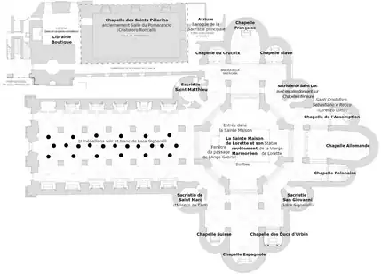 L’on recense huit chapelles : la chapelle du Crucifix, la chapelle des ducs d’Urbino, les chapelles française, allemande, polonaise, slave, espagnole et suisse.