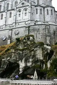 Située au-dessus de la basilique Notre-Dame-du-Rosaire qui fut édifiée plus tard, l'ensemble surplombant la Grotte de Massabielle où serait apparue la Vierge Marie à Bernadette Soubirous, lui révélant son identité (« Je suis l'Immaculée Conception »), la basilique a été construite de 1862 à 1871[2] sur les plans d'Hippolyte Durand et consacrée en juillet 1876[3]. Elle se révéla très vite insuffisante pour recevoir les nombreux fidèles venant en pèlerinage à Lourdes, ce qui décida les autorités ecclésiastiques à lancer la construction de la basilique inférieure.
