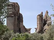 On n'a pas trouvé de socles d'éventuelles statues de divinités. Les tours, situées à la hauteur des escaliers, ont un diamètre intérieur de 12 mètres. Chacune des entrées principales, de 11,5 mètres de haut et semblables à des portes de temples, se trouvait du côté ouest des cours à colonnades associées. Les autres entrées étaient du côté du temple et du côté opposé. À une hauteur d'environ 16 mètres commencent les coupoles qui couvraient les bâtiments. Il n'y a pas de fenêtres dans les murs, on peut donc supposer que la lumière venait d'un oculus percé dans le dôme. À l'extérieur, on trouve des restes de marbre et, juste au-dessous du dôme, une corniche de marbre semble indiquer que les deux rotondes en étaient recouvertes.
