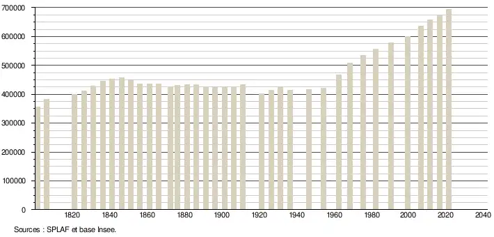- Population municipale légale en vigueur au 1er janvier 2024, millésimée 2021, définie dans les limites territoriales en vigueur au 1er janvier 2023, date de référence statistique : 1er janvier 2021.