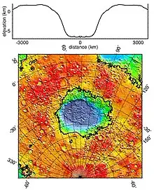 Hellas Planitia est un bassin d'impact d'environ 2 200 km de diamètre et 9 500 m de profondeur situé dans l'hémisphère sud de la planète Mars et centré par 42,7° S et 70,0° E dans les quadrangles d'Iapygia, de Noachis et d'Hellas. Il s'agit de la plus grande structure d'impact encore visible sur la planète, les suivantes par taille décroissante étant Argyre Planitia et Isidis Planitia. Sa formation serait contemporaine de celle de ces deux autres structures, et remonterait à la fin du Noachien, peut-être en relation avec l'hypothétique « grand bombardement tardif » (LHB en anglais) daté, d'après les échantillons lunaires, entre 4,1 et 3,8 milliards d'années avant le présent[3]. Le Bassin boréal, dont l'existence a été proposée en 2008[4], serait un bassin d'impact bien plus grand qu'Hellas, mais la réalité d'une telle structure, qui serait la plus vaste du système solaire, demeure encore à être confirmée.